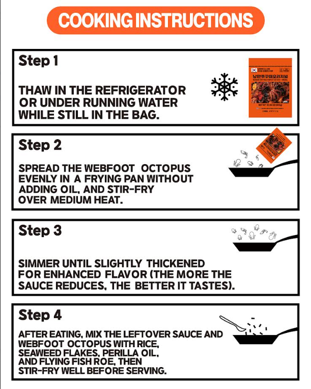 Heat a pan on medium-high. Add frozen/octopus pouch contents and stir-fry 3–4 mins until bubbling.