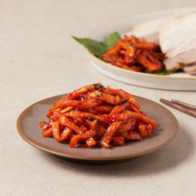 Jongga Seasoned Dried Radish is a traditional Korean side dish made from dried radish strips seasoned with a sweet, tangy, and mildly spicy sauce. This ready-to-eat banchan (side dish) is commonly paired with bossam (boiled pork wraps), but it also works well with rice, noodles, or as a standalone snack.