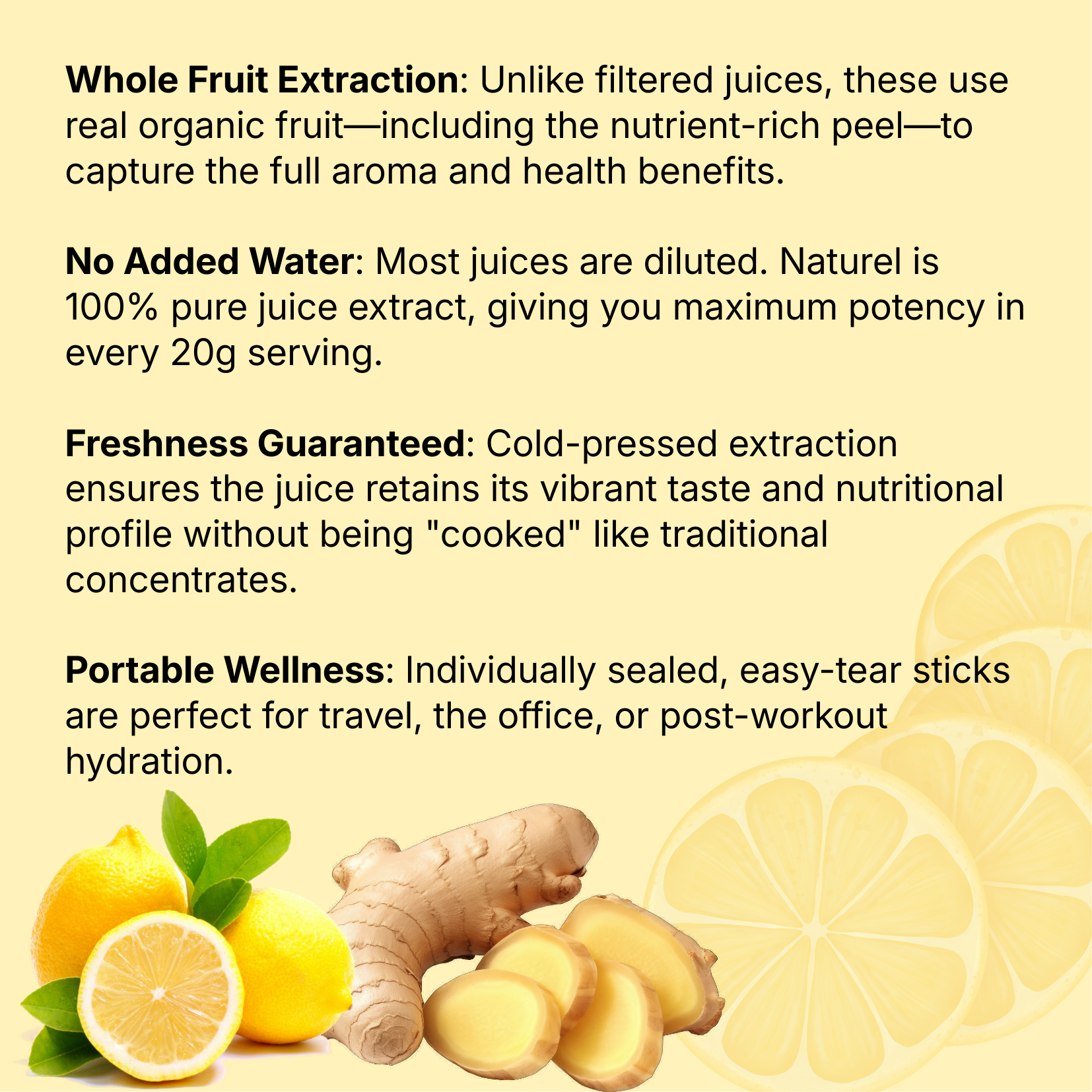 Experience the refreshing power of premium citrus in a revolutionary new format. Naturel Organic Juice Sticks provide the convenience of a sachet with the quality of a freshly squeezed organic fruit. This is 100% NFC (Not From Concentrate) liquid juice—not a powder—containing zero added water, sugar, or preservatives.